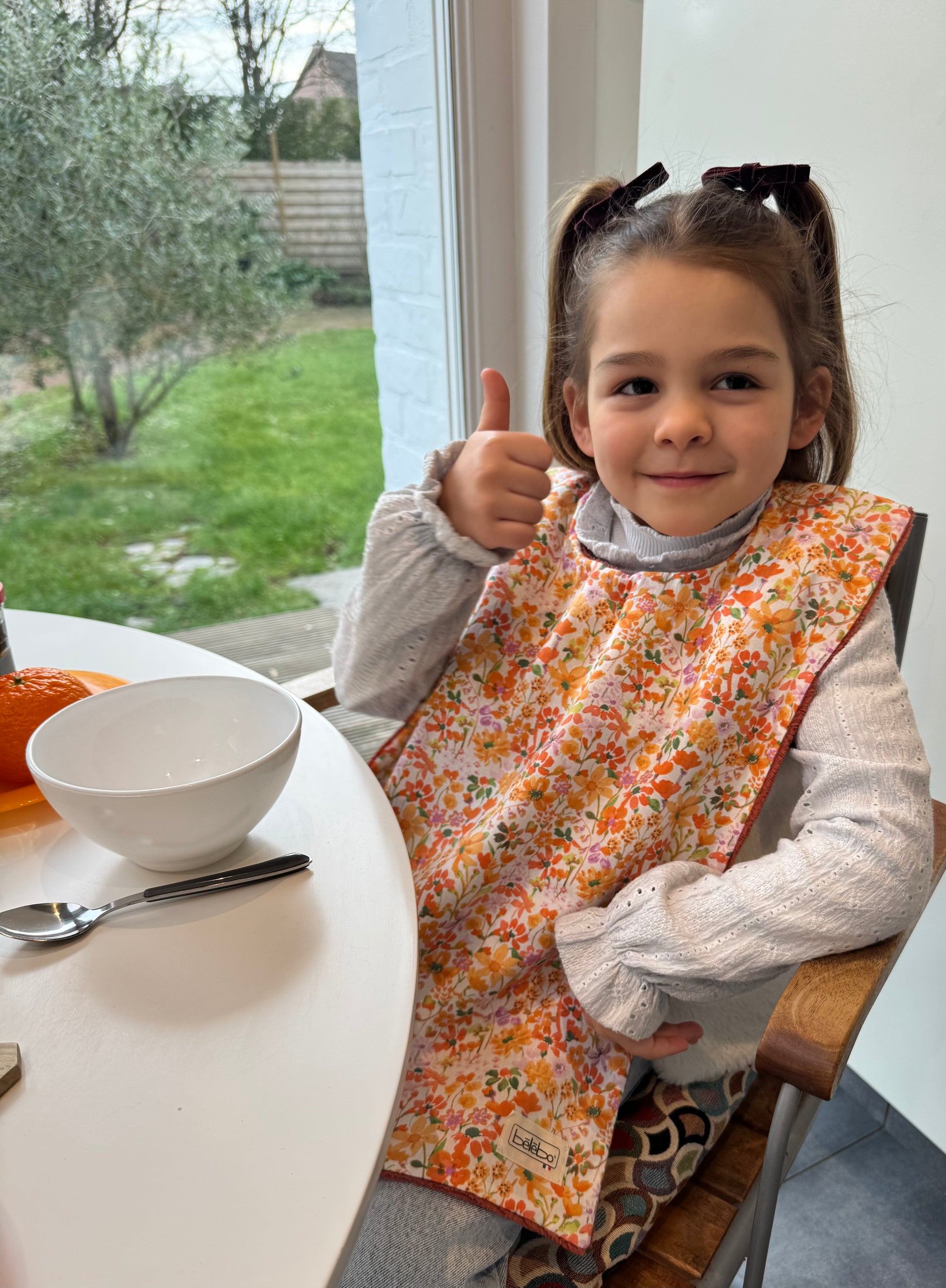 Fleurettes oranges qui amènent un peu de nature, de fraicheur, de légèreté. C'est un plaisir de porter ce joli BÉLÉBO® d’un grand raffinement. Pour les femmes comme pour les jeunes femmes ou les fillettes, il se distinguera forcément d’un motif de bavoir traditionnel.